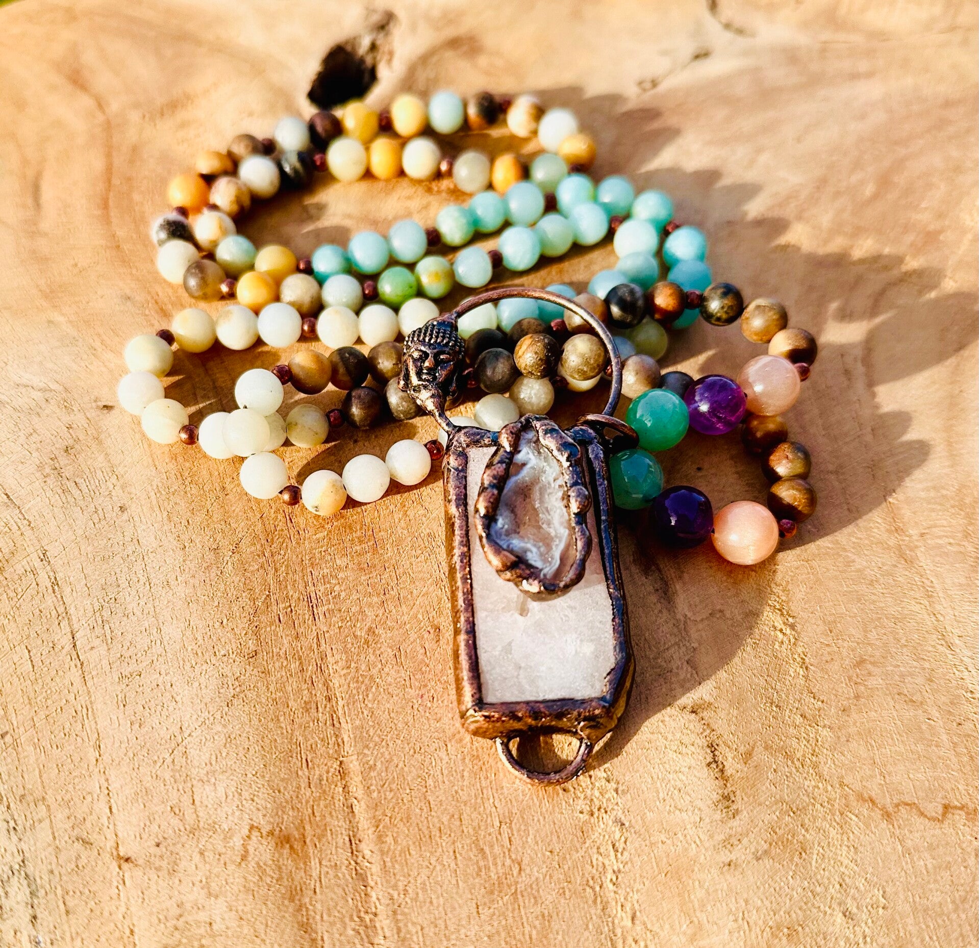 Mala 108 beads incl Gorgeous Ancient Crystal Buddha Pendant that hangs 45cm long. Heart opener, Calming, Soothing, Reconnecting
